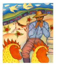 Elly Simmons is a fine artist from San Francisco. She has illustrated books with Children's Book Press (Magic Dogs Of The Volcano) and has been commissioned for numerous public projects. Her colorful work has been translated into tapestry by a Mexican weaver and into numerous greeting cards and calendars by Pomegranate Press. Her latest book is Calling The Doves by Juan Felipe Herrera (Children's Book Press, 1995). Her jacket for Go And Come Back (DK Ink, 1998) was spectacular.